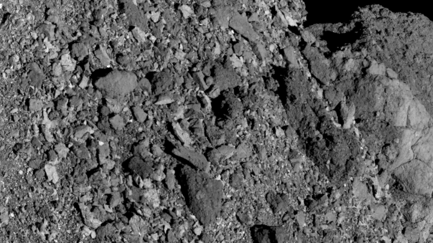This image shows a portion of the boulder that marks Bennu’s prime meridian. It was taken by the PolyCam camera on NASA’s OSIRIS-REx spacecraft on April 4 from a distance of 3 miles (4.7 km). The field of view is 216 ft (65.7 m). For scale, the highest point visible on the prime meridian boulder is 65 ft (20 m) tall, which is the same height as Delicate Arch in Arches National Park in Utah. The image was obtained during Flyby 5A of the mission’s Detailed Survey: Baseball Diamond phase. When the image was taken, the spacecraft was over the northern hemisphere, pointing PolyCam east and downward toward the southern hemisphere.