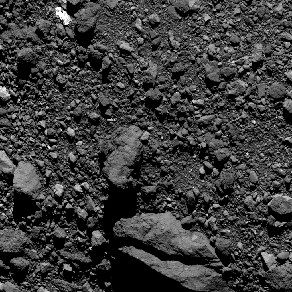 This image shows a large fractured boulder and a smaller reflective rock located in a region of asteroid Bennu’s southern hemisphere. It was taken by the PolyCam camera on NASA’s OSIRIS-REx spacecraft on April 5 from a distance of 1.7 miles (2.8 km). The field of view is 127 ft (38.8 m). For scale, the length of the fracture on the large boulder is 50 ft (15.1 m), which is the width of a basketball court. The image was obtained during Flyby 5B of the mission’s Detailed Survey: Baseball Diamond phase. When the image was taken, the spacecraft was over the southern hemisphere, pointing PolyCam south and west.