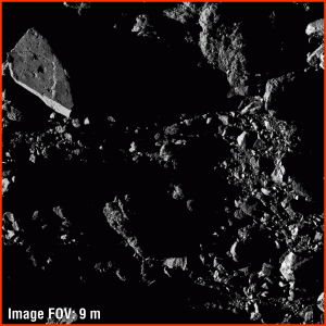 This series of four images showcases the different fields of view captured on asteroid Bennu by the OSIRIS-REx spacecraft’s camera suite. The images are of an area near sample site Sandpiper, which is located in Bennu’s southern hemisphere. The first, and closest, image shows a 9-foot (2.8-meter), sharp-edged boulder. It was taken by the PolyCam camera on July 3, from a distance of 0.4 miles (0.7 km), while the spacecraft was in Orbital B phase. The field of view is 30 ft (9.3 m). The second image was also taken by PolyCam on April 5 from a distance of 1.7 miles (2.8 km), during Detailed Survey: Baseball Diamond phase. The second image’s field of view is 128 ft (38.9 m). The third is a MapCam image taken on April 29, during Detailed Survey: Equatorial Stations phase, from a distance of 1.5 miles (2.4 km). The field of view is 550 ft (167.6 m), and site Sandpiper is visible inside the large crater on the left side of the image. The final image is a mosaic of images taken by PolyCam on December 2, 2018, the day before the spacecraft arrived at Bennu. The field of view is slightly wider than 1,640 ft (500 m) and the spacecraft was 15 miles (24 km) from the asteroid.